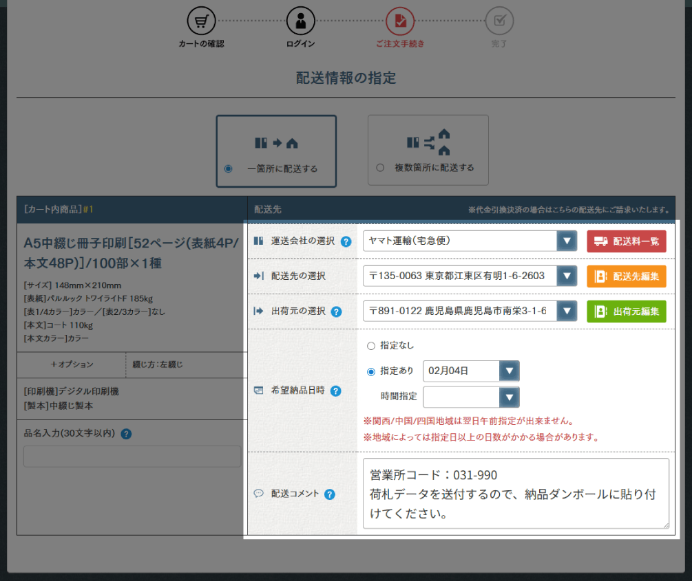 登録した配送先は、ご注文手続き時の配送先選択で指定できます。