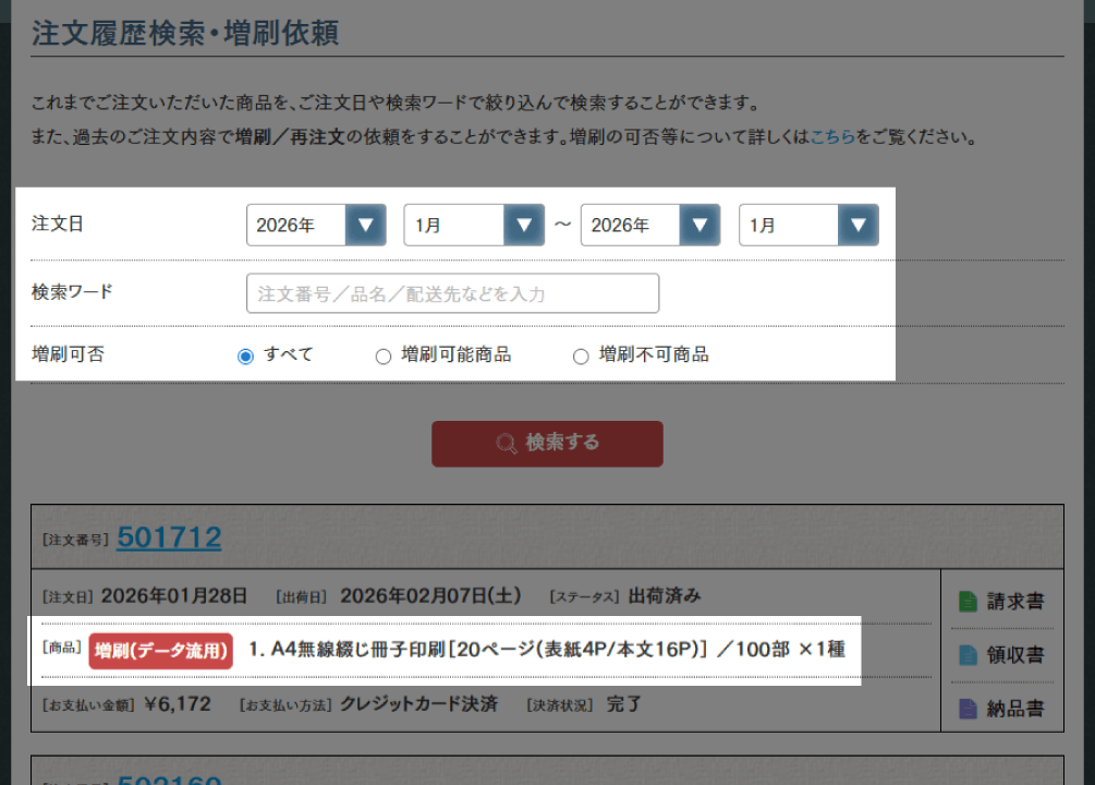 注文履歴・増刷ページで、注文日・検索ワード・増刷可否を指定して対象商品を検索します