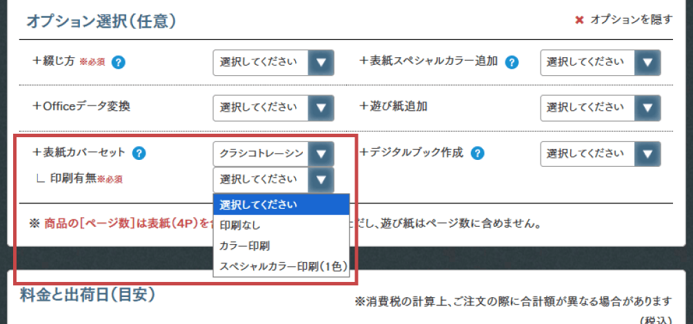表紙カバーセットの料金・追加納期