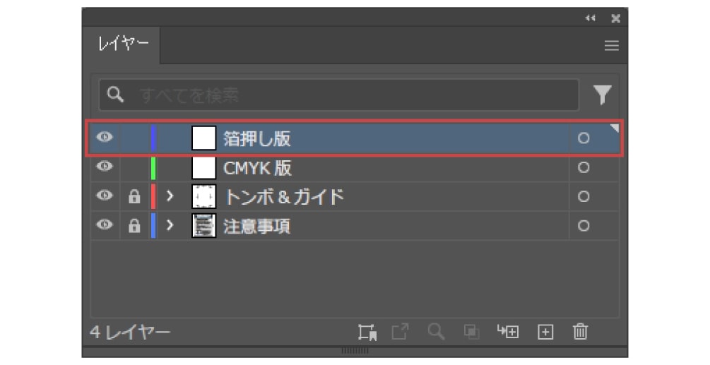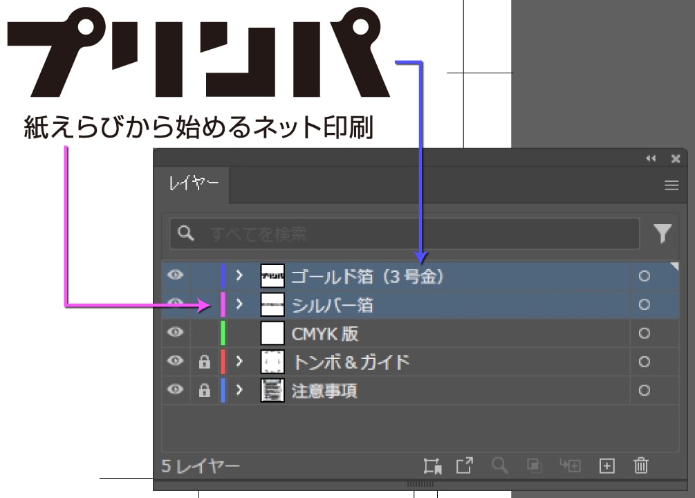 多少ズレても白がでないように、箔押し加工部分の下にも絵柄を印刷用レイヤーに配置してください。